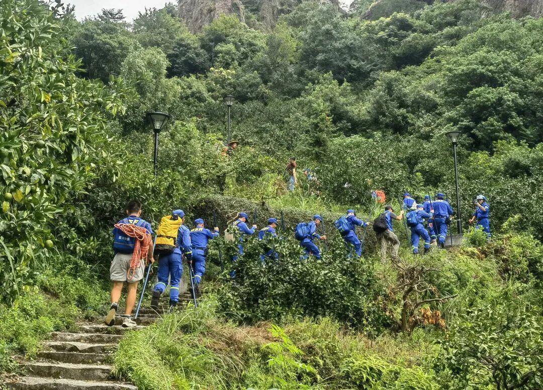 接警后,当地警方连夜使用无人机展开初步搜寻。桃渚镇武坑村村民也自发参与搜救,但未发现踪迹。自9月18日起,多支专业救援队伍加入搜救行动,重点排查岩缝、崖底等险要地段,并动用搜救犬、无人机等设备持续搜寻。