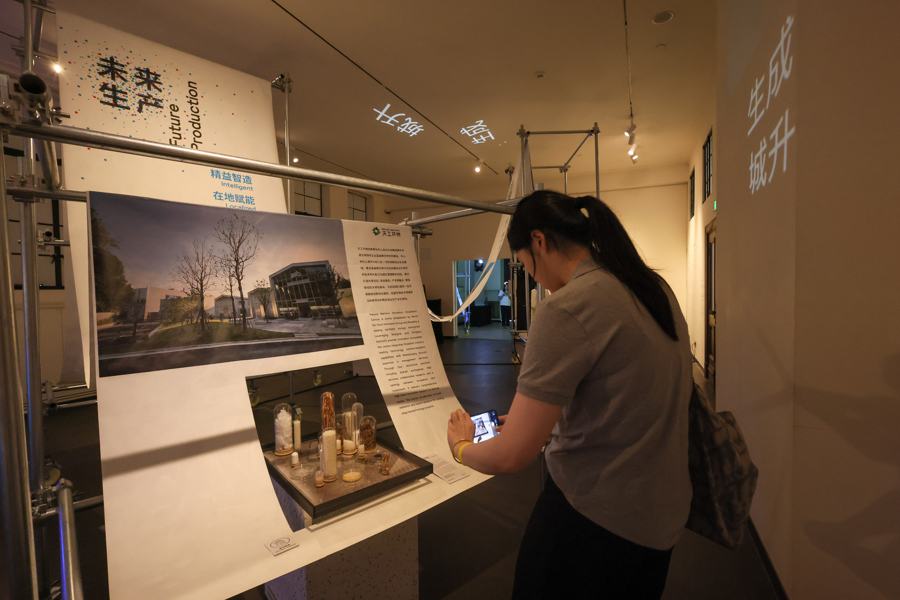 以展览中“未来生产”版块为例。这里以图文介绍了合成生物技术企业蓝晶微生物、虹口区天工开物创新孵化中心,也分享了英国伦敦一处废弃苗圃被改造成社区食品种植中心、澳大利亚悉尼一家微型工厂将电子废弃物回收转化为3D打印线材等经验,体现在地赋能循环再生的理念。在上海创新创意学院设计的装置《生长的天际线》中,底部是一份上海医疗手术器械厂的园区老地图,这里通过城市更新已蝶变为蓝晶微生物等企业所在的北科创生物产业园。地图上陈列了一组蓝晶微生物的试管与培养皿,其内放置了企业自主研发的可降解材料PHA。策展人介绍,这是将微观生物制造映射为宏观城市图景,以“生物制造”的天际线演绎从实验室到产业的转化之路。